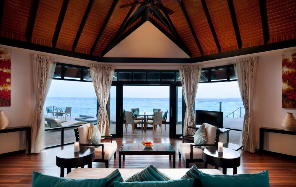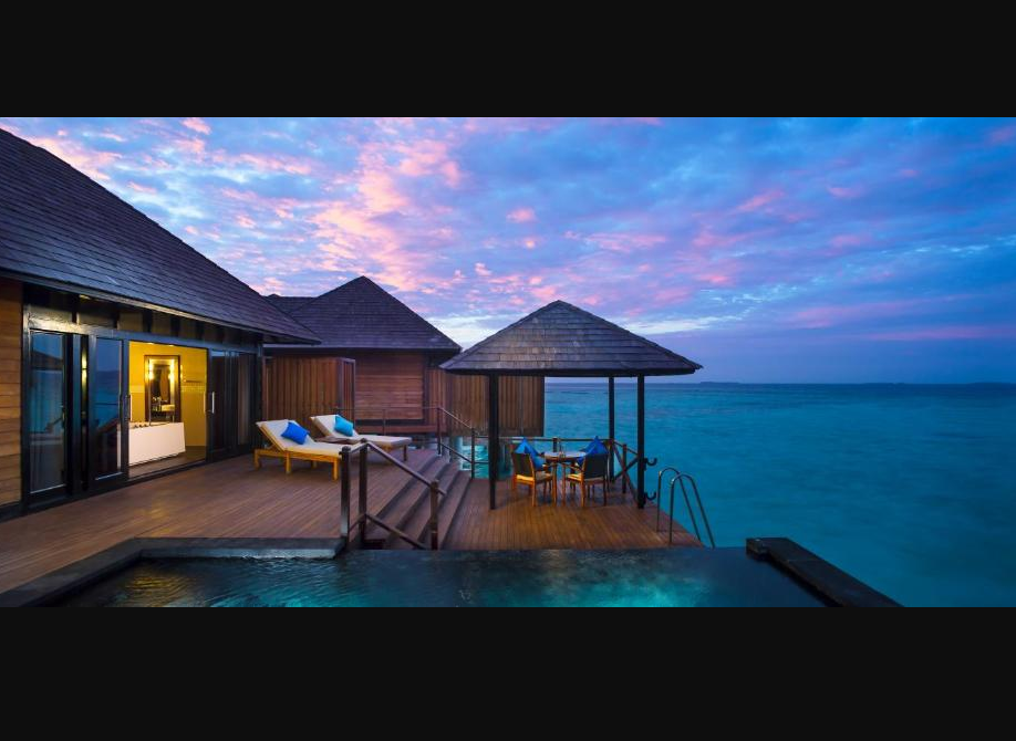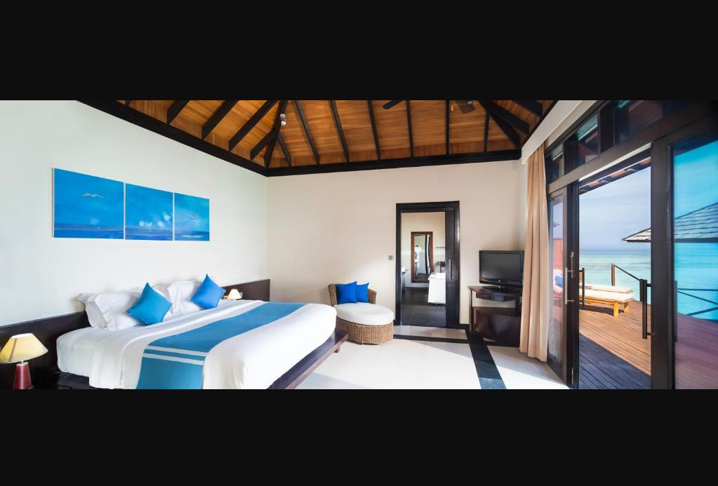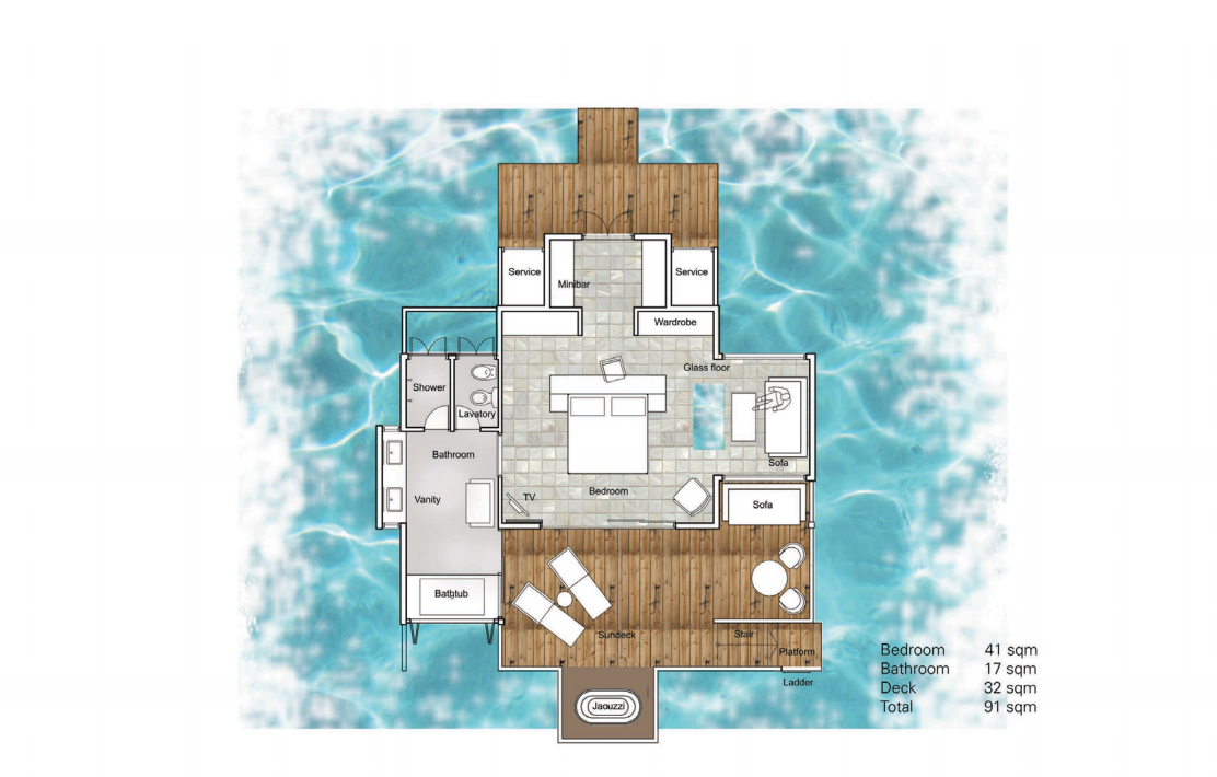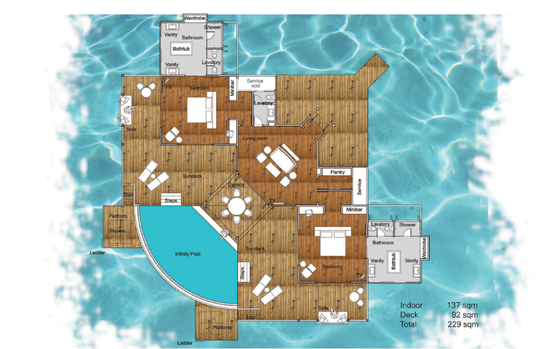 房型介绍:水上别墅从特大号床、休息区和宽敞的阳光甲板望去,优雅的开放式客厅和一块天然调色板完美融入了无边的海景。 宽敞的浴室配备了双洗手盆和露天水上淋浴,水疗浴缸适合您一边悠闲地泡澡,一边欣赏令人着迷的海景。