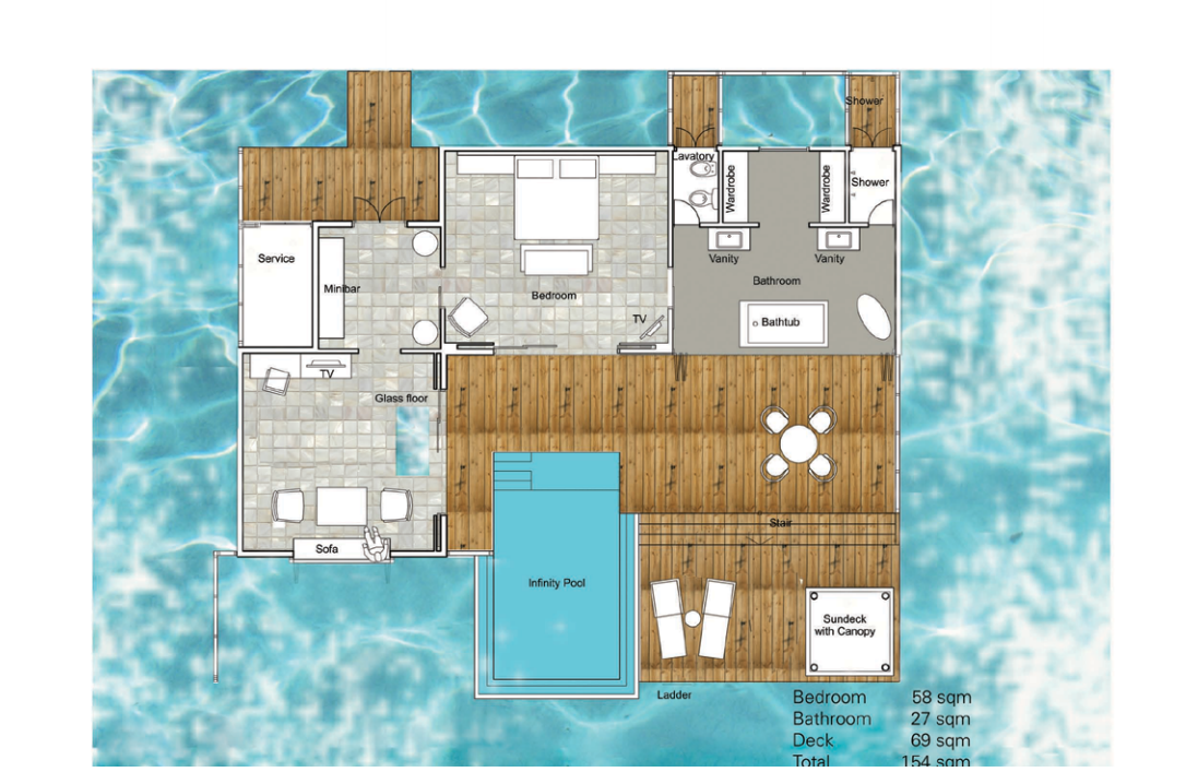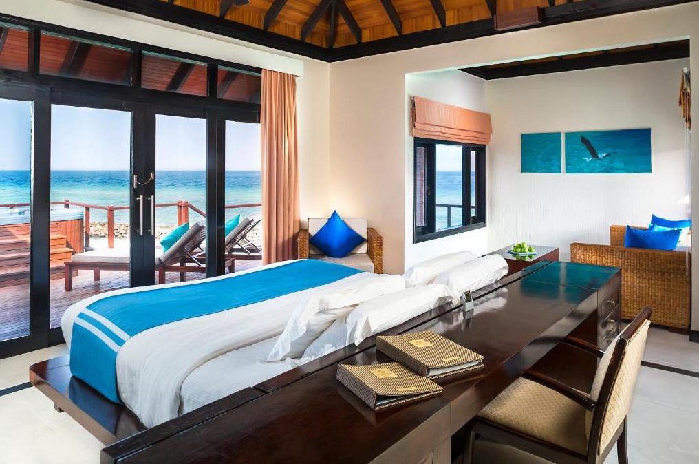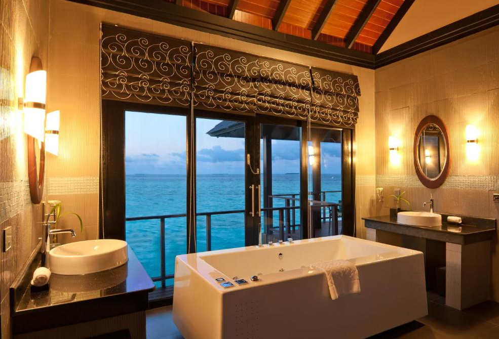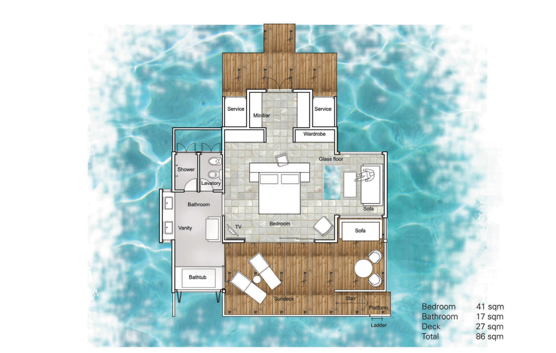房型介绍:水上别墅从特大号床、休息区和宽敞的阳光甲板望去,优雅的开放式客厅和一块天然调色板完美融入了无边的海景。 宽敞的浴室配备了双洗手盆和露天水上淋浴,水疗浴缸适合您一边悠闲地泡澡,一边欣赏令人着迷的海景。