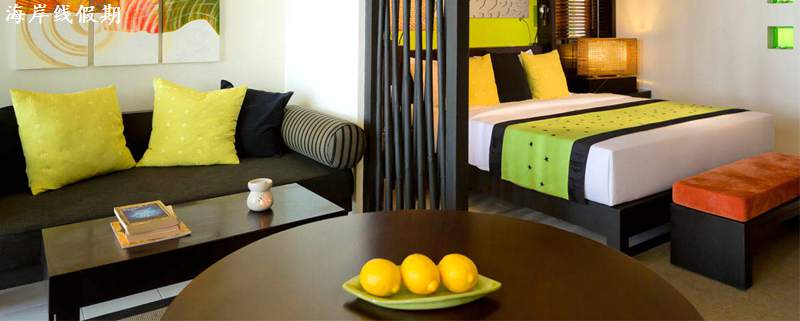 房型介绍:海滨按摩池别墅拥有配备餐桌和椅子的阳台,您可以在户外秋千上阅读或冥想,一边慵懒地摇晃,户外淋浴和专属按摩池让您充分放松。 墙上挂着五颜六色的艺术品,色彩亮丽、质地柔软的装饰和黑色家具形成鲜明对比,宽敞的入口确保室内自然光线充足,打造出一片温润明亮的空间。