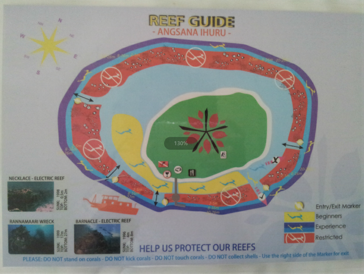 ①. 周围环绕着马尔代夫保存最完好的珊瑚礁之一,环礁在岛屿周围形成了一个几乎完美的圆圈,极其适合浮潜和海沟潜水。