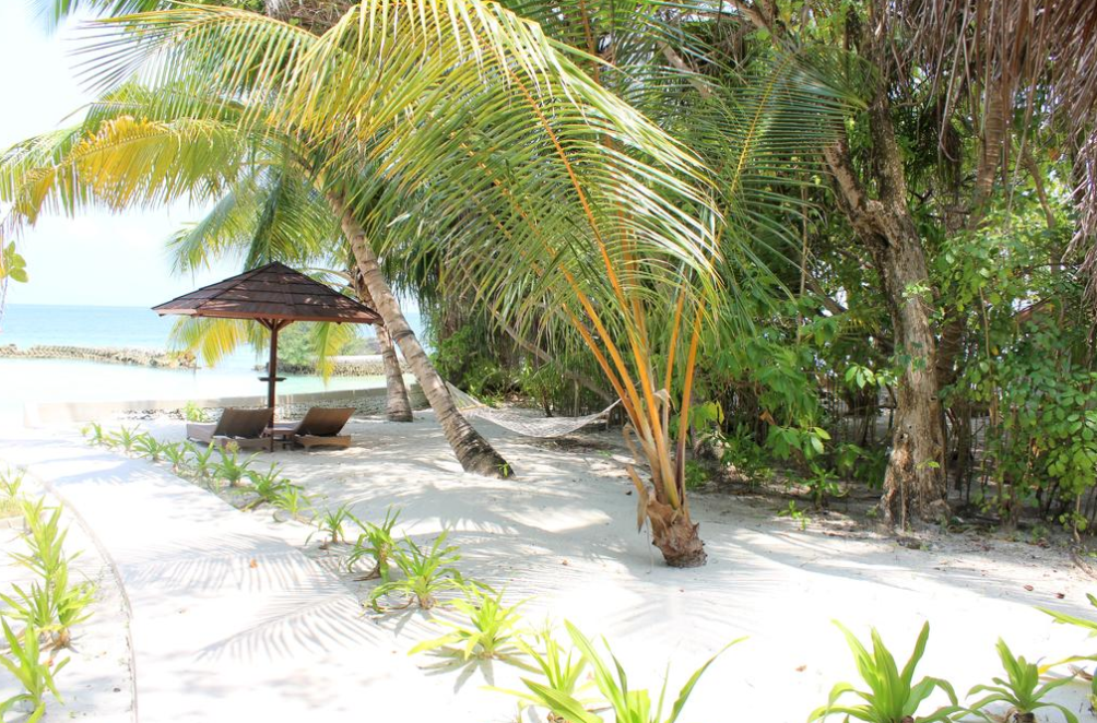 位于岛的中心地带,被繁茂的植被包围。客人可以享用的公共海滩(一端在咖啡店和另一端在岛的太阳椅和遮阳伞,淋浴处),设施齐全。