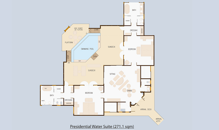 | 水Presidential Water Suite--总统水上套房 | 2 | 271.1 平 | √ | 5大 |