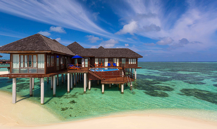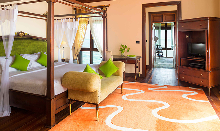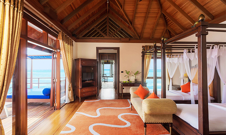 总统水上别墅可提供无障碍的辽阔视野和完全的私密空间。套房融合了现代设计和传统马尔代夫式建筑风格。房中有两间卧室,屋外是双层式柚木阳台,第一层阳台设有私人泳池和露天按摩浴池,第二层阳台上有可供直接下海浮潜的楼梯。