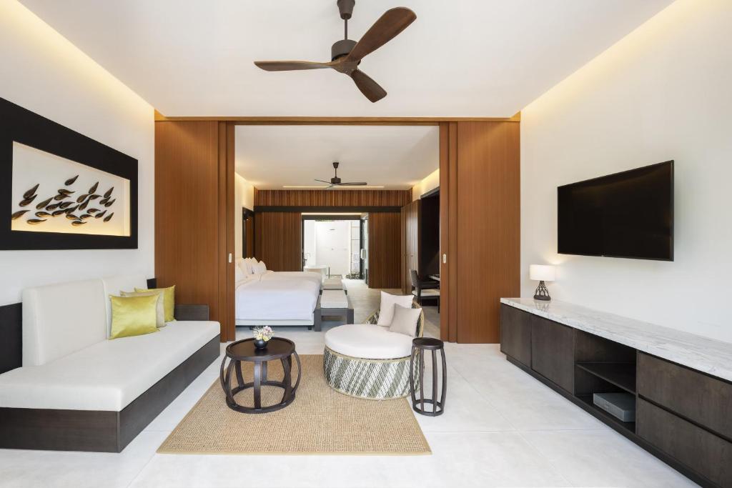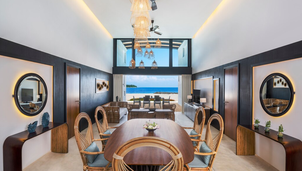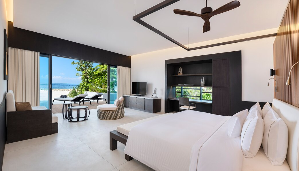 房型介绍:客厅直接通往海滩,可以看到广阔的、恢复活力的印度洋水域。