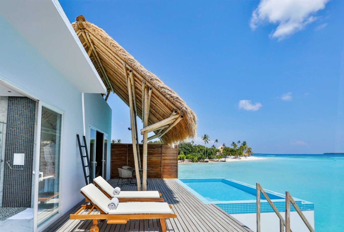 海洋泳池别墅,海景,128平米 位于海上,距珊瑚礁几步之遥 衣帽间,1卧室,阴凉区,私人泳池。 海洋泳池别墅,大床及沙发床。现代简约风格装潢。木质地板,位于海上,距珊瑚礁几步之遥。私人阴凉区供您享受海洋美景并可从别墅内直接入海,衣帽间,免费迷你小冰箱,茶&咖啡设备,保险箱,卫星电视,空调,室内及室外淋浴,室外花园浴缸间,双洗脸盆,独立卫生间。