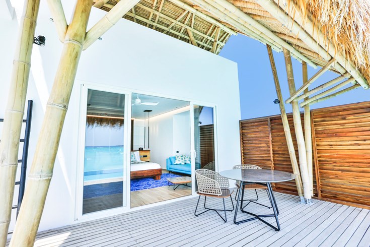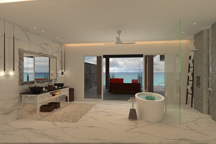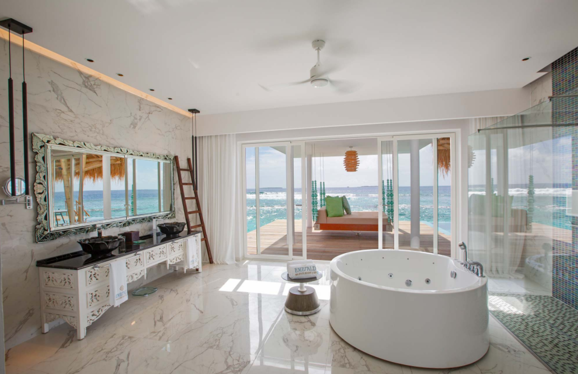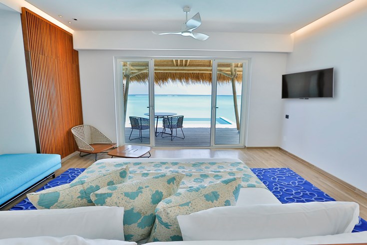 按摩池海洋别墅,海景,128平米 位于海上,距珊瑚礁几步之遥 衣帽间,1卧室,阴凉区,按摩池 按摩池海洋别墅,大床及沙发床。现代简约风格装潢。木质地板,位于海上,距珊瑚礁几步之遥。私人阴凉区供您享受海洋美景并可从别墅内直接入海,衣帽间,免费迷你小冰箱,茶&咖啡设备,保险箱,卫星电视,空调,室内及室外淋浴,室外花园浴缸间,双洗脸盆,独立卫生间及按摩池。