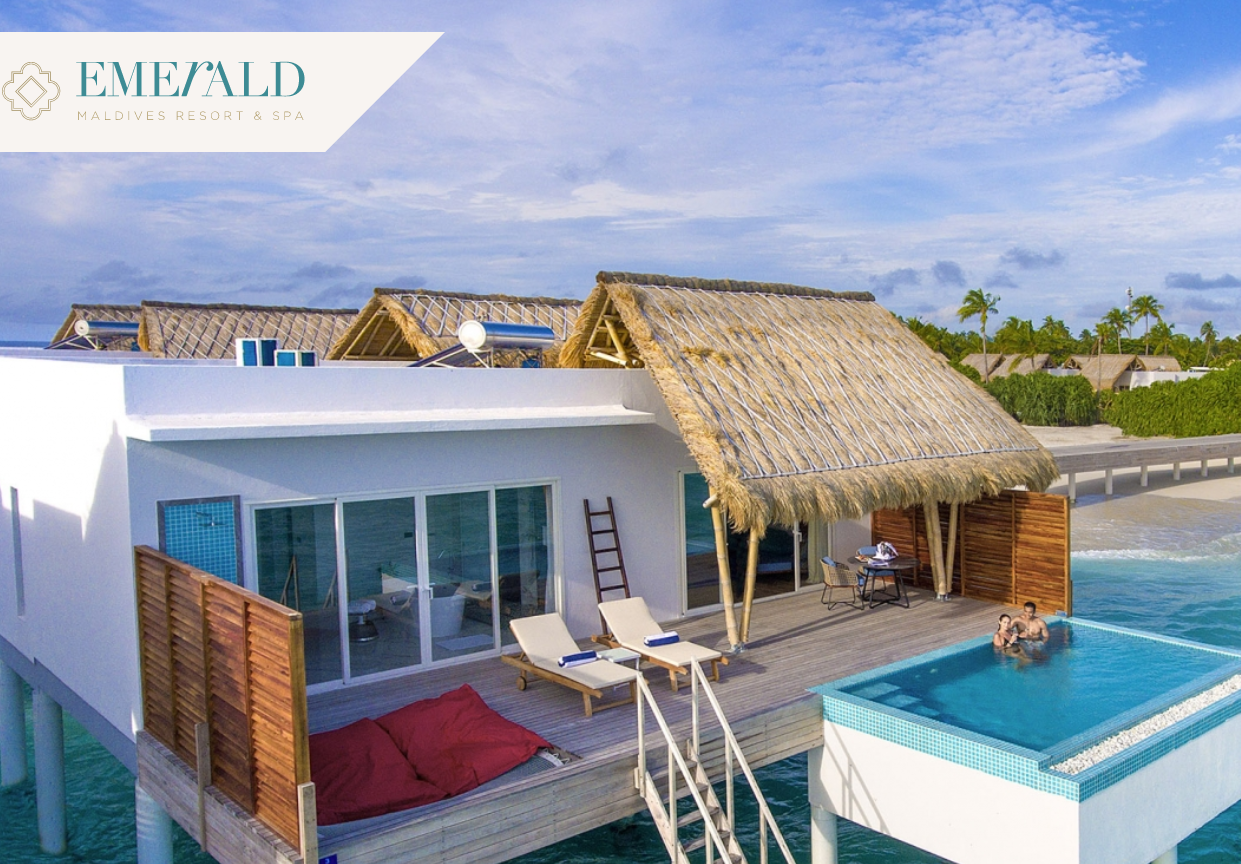 翡翠岛 (Emerald Maldives)座落在拉环礁(Raa Atoll)。从马累国际机场搭乘水飞40分钟或内飞+快艇35+10分钟即可到达。属于中型岛屿,环岛一周步行约19分钟,周长约1800米,面积21.06万平方米(646米*326米)。于2018-12开业。
