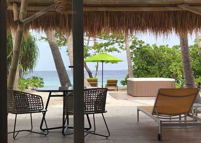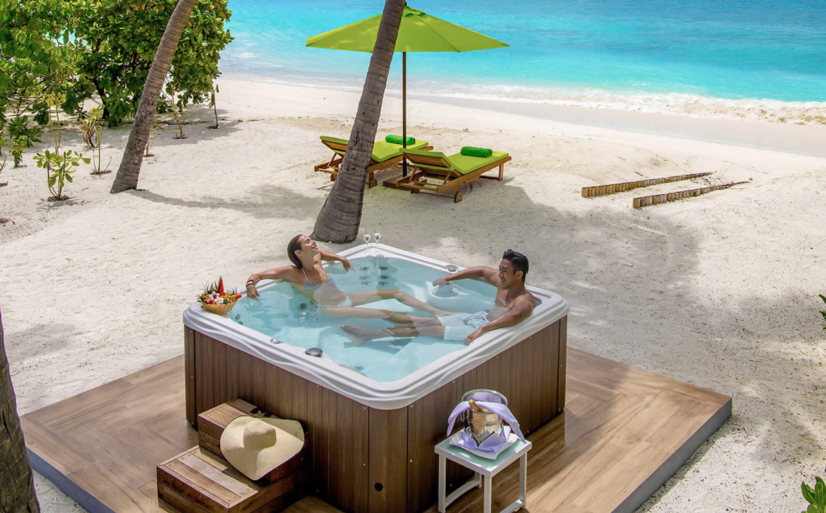 按摩池海滩别墅,海景,127平米 位于海滩,距珊瑚礁几步之遥 衣帽间,1卧室,阴凉区,按摩池。 按摩池海滩别墅,大床及沙发床。现代简约风格装潢。木质地板,位于海滩,距珊瑚礁几步之遥。私人阴凉区供您享受海洋美景,衣帽间,免费迷你小冰箱,茶&咖啡设备,保险箱,卫星电视,空调,室内及室外淋浴,室外花园浴缸间及按摩池,双洗脸盆,独立卫生间。