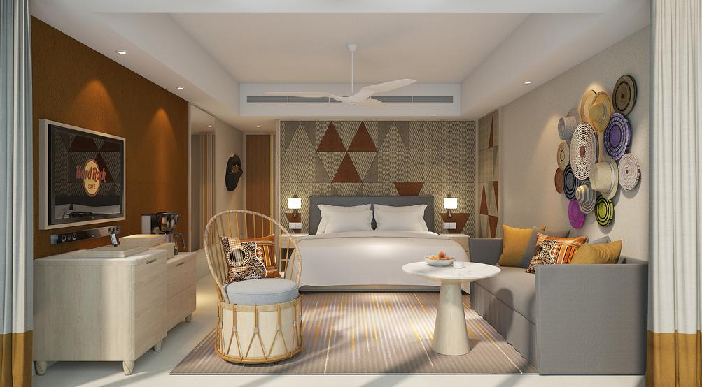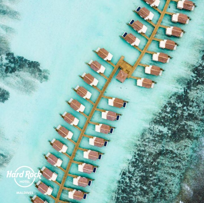 硬石酒店 (HARD ROCK )座落在卡夫环礁(Kaafu Atoll),注意:卡夫环礁以前是分为北马累环礁与南马累环礁的。从马累国际机场搭乘快船15分钟即可到达。属于中型岛屿,环岛一周步行约14分钟,周长约1360米,面积9.24万平方米(494米*187米)。于2019.9.1开业。