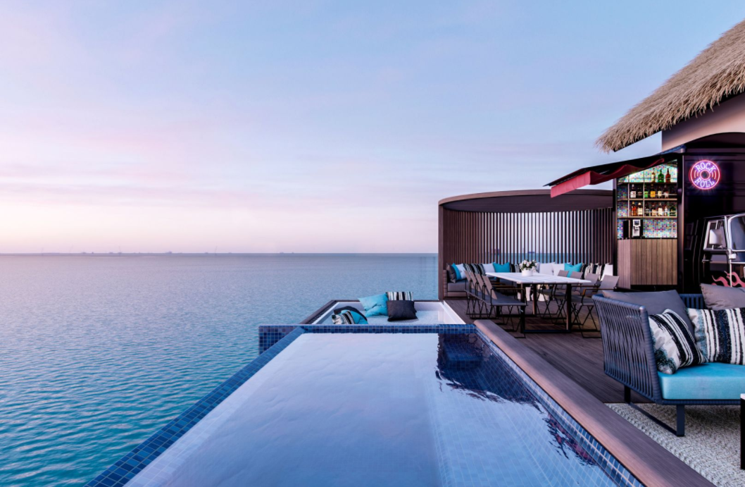 【分TWIN BED与大床房】白金水上泳池别墅位于水上,设有无边泳池,私人露台,日光躺椅和直通泻湖。