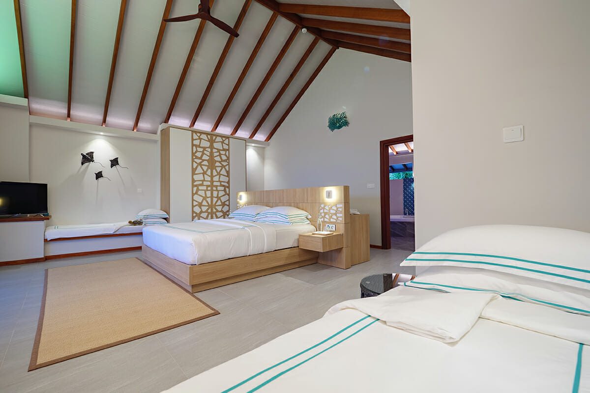 从沙滩到大海只有几步之遥,便可欣赏整个印度洋美景,或下去潜水,无数的海底生物在等着你!两卧室泻湖海滩泳池别墅很适合一个大家庭或两个小家庭入住,与亲人、友人在极乐岛,体验极致乐趣。
