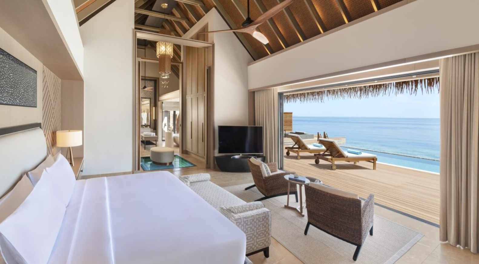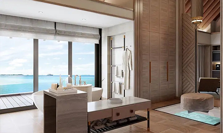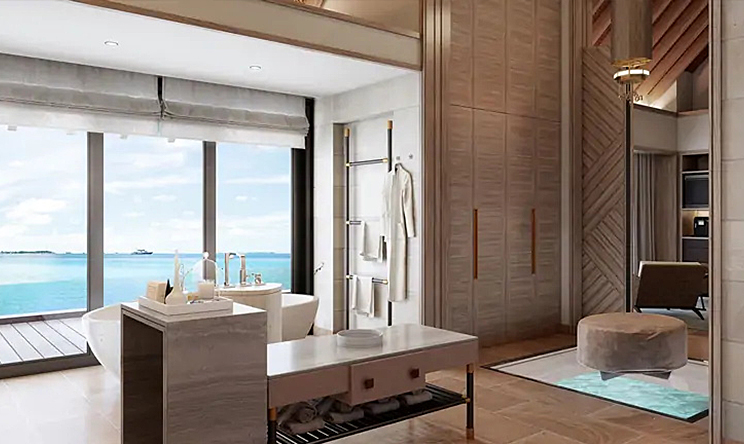透过落地窗和推拉门欣赏海洋之美,将波光粼粼的大海和远处的天际线尽收眼底。华尔道夫特大床和先进的视听娱乐设施让您放松身心。浴室设有浸泡式浴缸以及室内和室外淋浴,更衣室设有玻璃地板可观赏热带礁石和鱼类。步出别墅,在泳池或大海中畅游,在凉亭中用餐,在躺椅或水上吊床上度过慵懒时光。