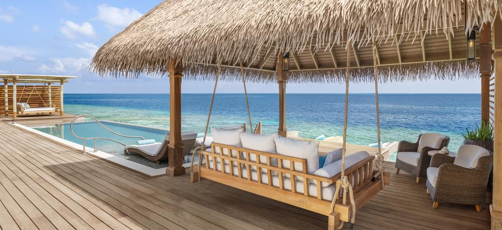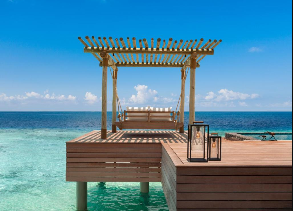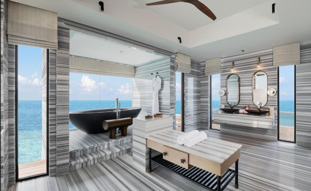 部分可看日出和日落景观。房间与普水差不多,多了一个客厅,泳池面积更大。 无边泳池,玻璃地板,吊床,网床,应有尽有。 沉浸在马尔代夫的经验与地板到天花板的窗户和滑动门开放的无尽的海景。木制的甲板提供了直接的海洋通道,而在无限的游泳池旁边是水上吊床、日光浴躺椅和餐厅露台。空调客厅和餐厅配有视听娱乐设施和舒适的沙发。卧室里有一张超大号的华尔道夫酒店(Waldorf Astoria)特色床和休息区,而更衣室里的玻璃地板展示着下面的热带珊瑚礁。 酒店不建议8岁以下儿童入住水屋,如要入住父母需签署免责协议 有分为大床房和双床房。