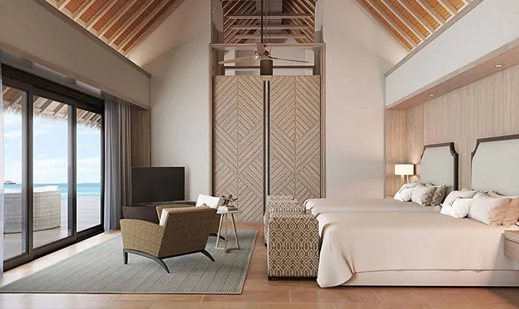 与Reef Villa with Pool房型大致一样:靠近岸边,绿色前花园和泻湖上的露台。 主要是,加了一个客厅,更大的游泳池。 客人可以在一个水上吊床旁边的无限泳池,吸收阳光的躺椅,或享受一顿饭在餐厅露台上的自然之美。室内客厅和餐厅配备了最先进的娱乐设施,沙发和落地窗。宽敞的卧室设有一个国王大小的华尔道夫酒店签名床和休息区,更衣室和诱人的浴室。 有分为大床房和双床房。