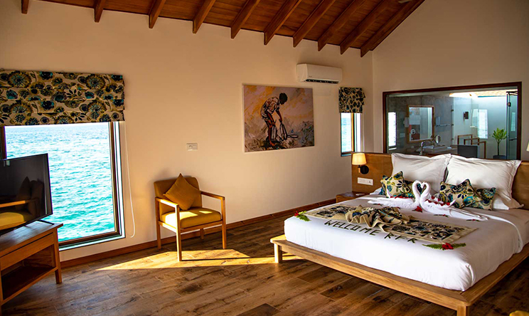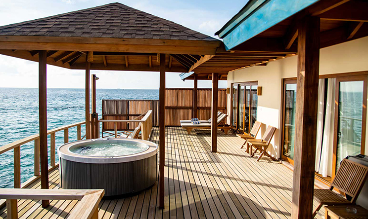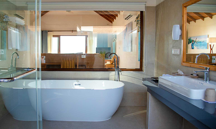 房型介绍:行政套房建在蓝色泻湖水上的高跷上,让您感受到最好的马尔代夫。您可以在按摩浴缸中放松身心,欣赏壮观的阳台景色。享受最舒缓的体验,因为海浪的声音轻轻地靠在高跷上。