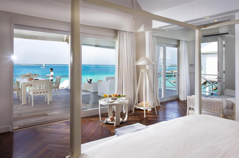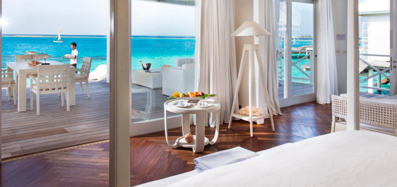 水上别墅全都拥有私人露台,可直接通向水中。别墅中精致的家具摆设布满整个空间,包括藤制家具,意大利当代灯饰和手工镶的木质楼梯,使客人在假期中实现梦幻度假的感受。