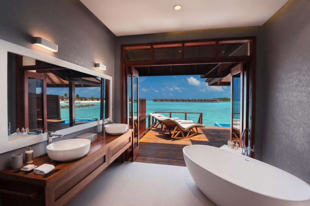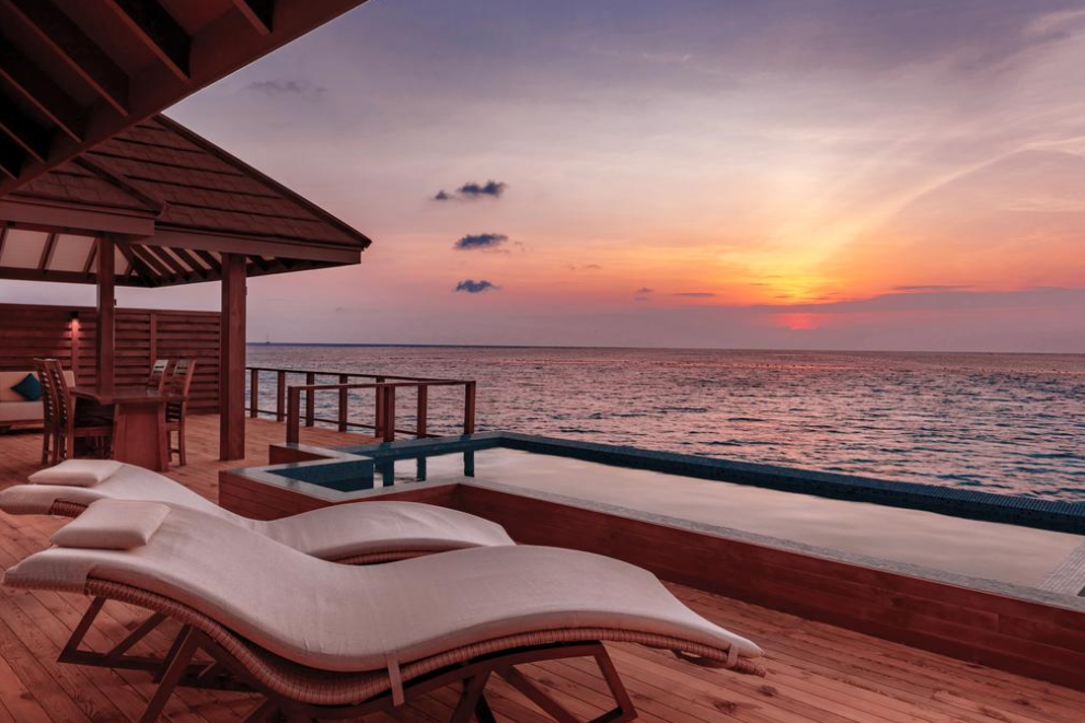 可直接欣赏日落美景的独特水上套房,特殊的别墅内服务和15平方米的私人游泳池。 套房设有宽敞的卧室和相连的客厅,豪华的浴室以及可直接通往泻湖的甲板。