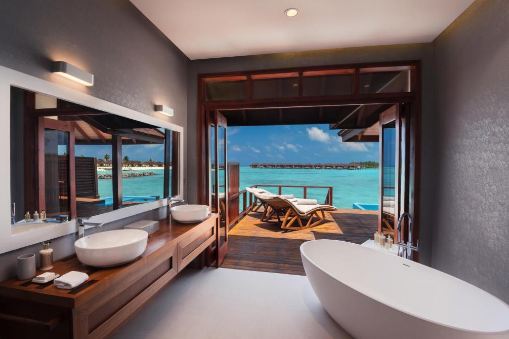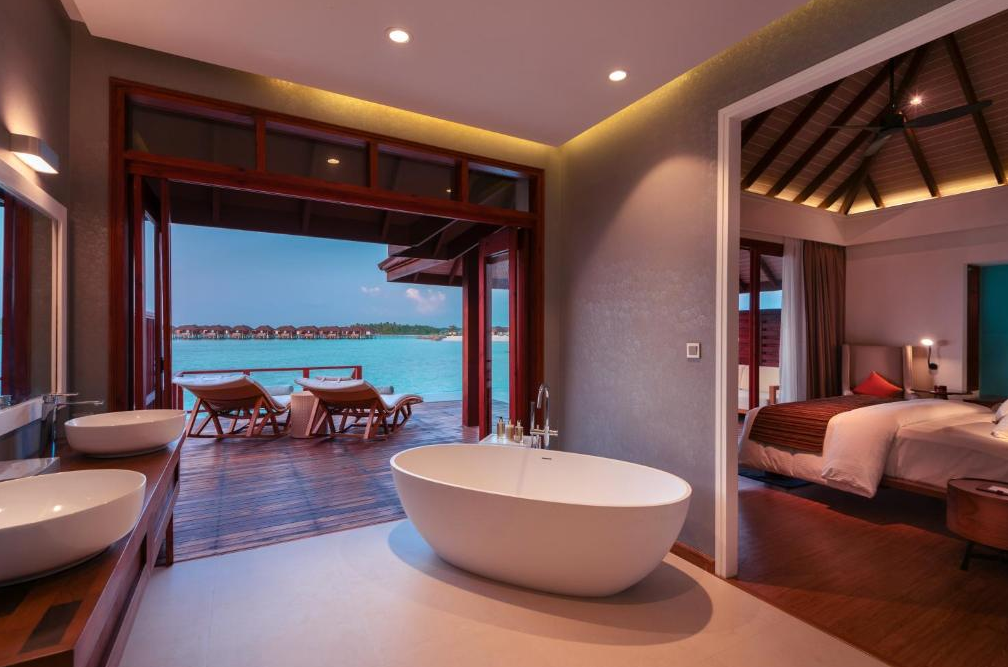 可直接欣赏日落美景的独特水上套房,特殊的别墅内服务和15平方米的私人游泳池。 套房设有宽敞的卧室和相连的客厅,豪华的浴室以及可直接通往泻湖的甲板。