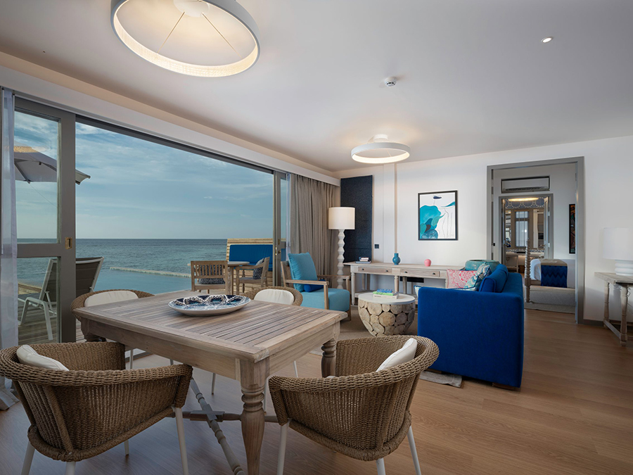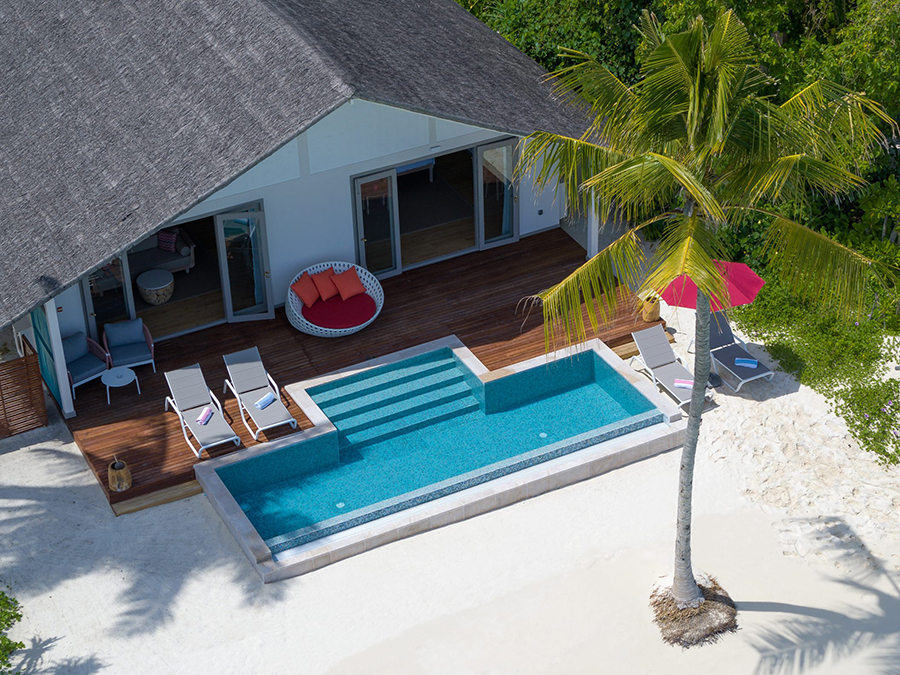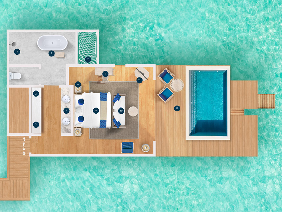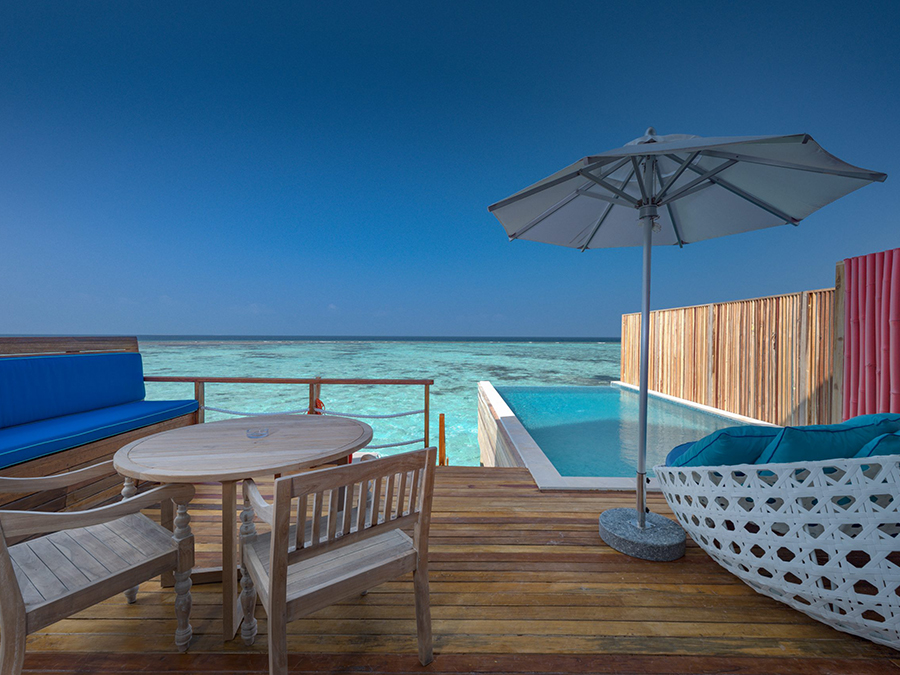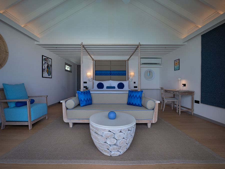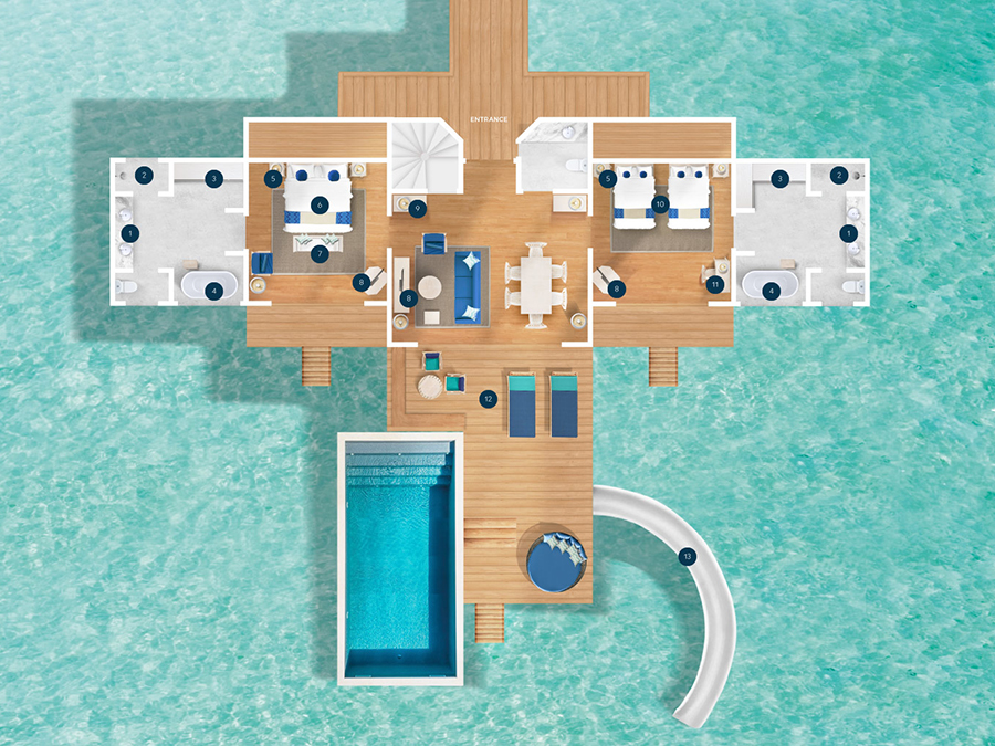 房型介绍:复式潟湖泳池别墅总共只有2间,是两层独栋别墅,卧室位于楼上,楼下有起居室、露台和私人游泳池,最多可入住3个大人或者2大1小。如果你感觉到海浪的歌声,你可以跳下台阶,一头扎进深蓝。当你想打盹的时候——或者别的什么时候——上楼去睡一张能看到令人瞠目结舌的海景的床。