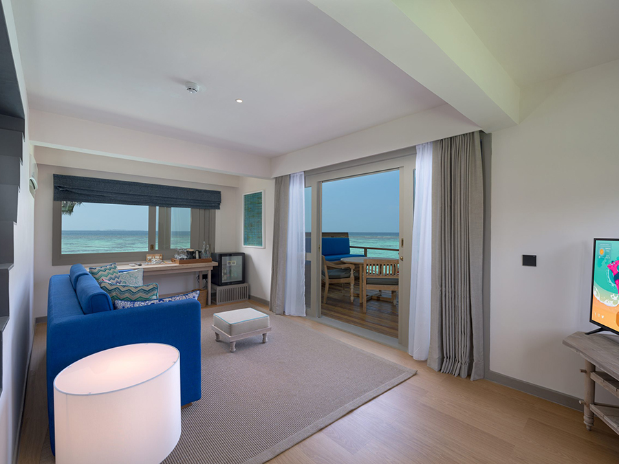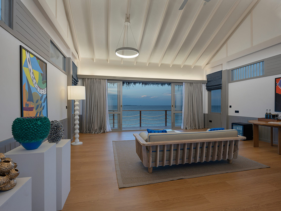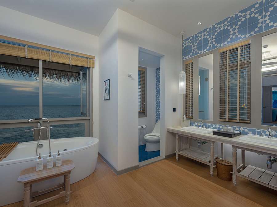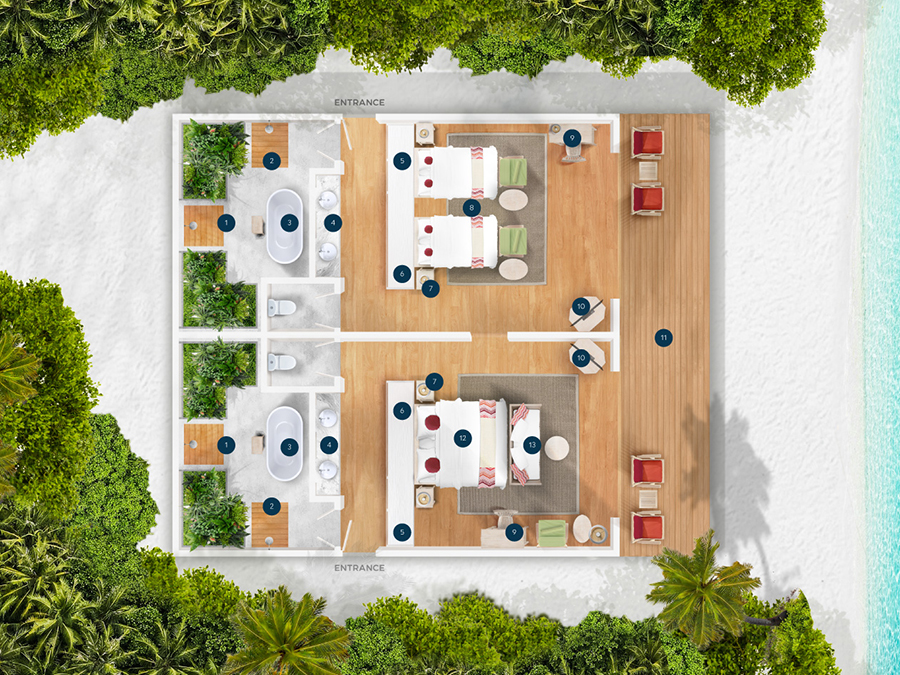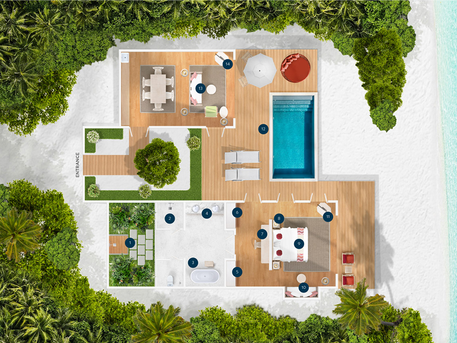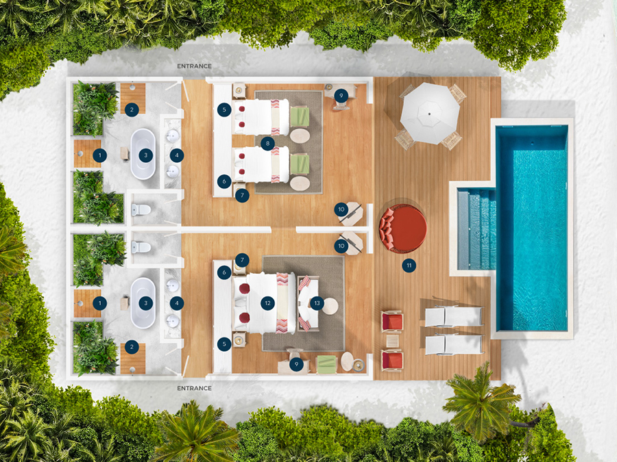 房型介绍:复式潟湖泳池别墅总共只有2间,是两层独栋别墅,卧室位于楼上,楼下有起居室、露台和私人游泳池,最多可入住3个大人或者2大1小。如果你感觉到海浪的歌声,你可以跳下台阶,一头扎进深蓝。当你想打盹的时候——或者别的什么时候——上楼去睡一张能看到令人瞠目结舌的海景的床。