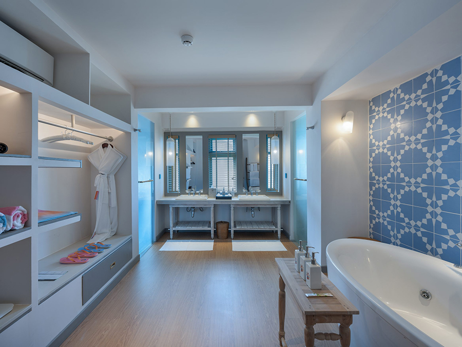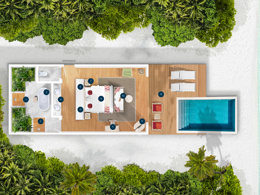 房型介绍:潟湖泳池别墅的面积更大,总共有15间,带私人泳池,最多可入住2大1小。如果你喜欢大海,那恭喜你,你已经找到了你的田园诗般的岛屿家园。从你的一居室别墅里游出来,进行一些浮潜和海上恶作剧,然后在你的私人泳池边拿着一本书和一杯啤酒回到甲板上休息一会儿。如果水不够的话,里面有一个双人独立式浴缸和一个淋浴器。活在梦想中。