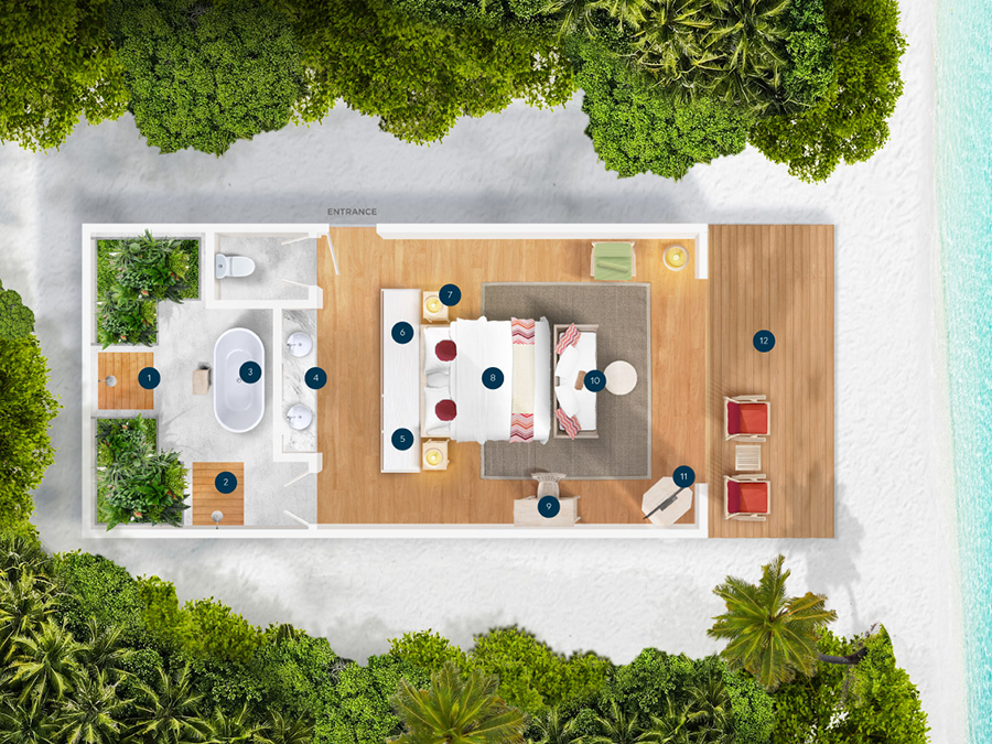 房型介绍:这是酒店的基础沙屋,不带私人泳池,总共有28间,面积虽然只有68平米,但也属于独栋别墅,最多可以入住2大2小或者3大1小。如果你是蜜月度假,你们两个可以在这一间卧室的海滨小屋里互相依偎。当你扑通一声躺在特大号床上时,你能听到的唯一声音就是屋外的鸟儿飞来飞去。你还可以在甲板上喝咖啡欣赏日出,然后在下面的海滩上玩一整天。