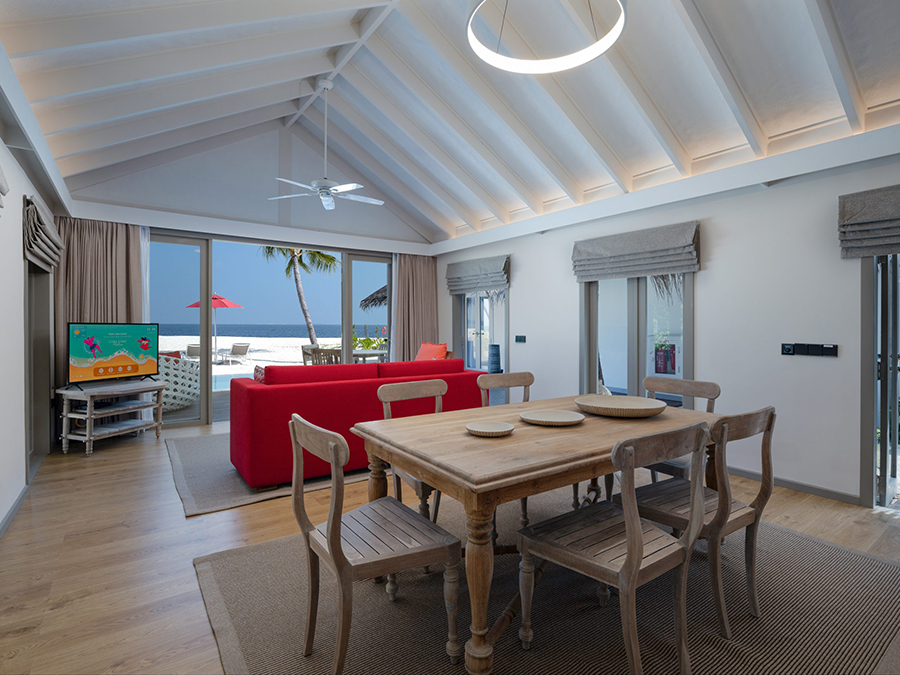 房型介绍:双卧家庭沙滩泳池别墅只有三间,拥有两间独立的卧室,带私人泳池,面积153平米,最多可住4大2小非常适合家庭度假。从私人游泳池出去几步就是大海,沙滩上有很多小螃蟹,小朋友们可以和它们一起嬉戏一会儿,然后在甲板上放松一下,观看它们在下面的沙滩和浅滩上嬉戏。