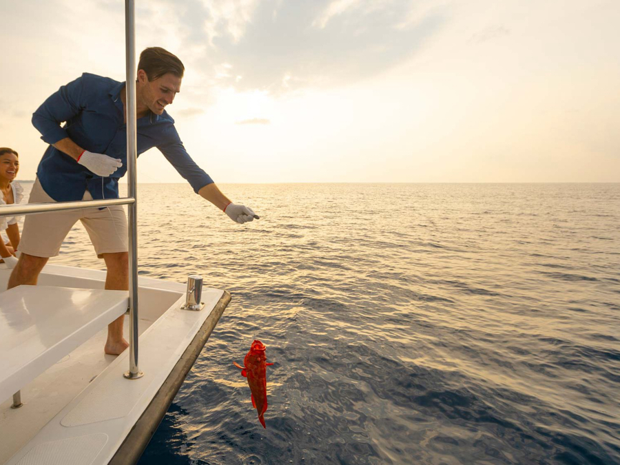 活动介绍:度假村的五星级潜水中心位于抵达码头附近,非常容易进入大海进行PADI课程或短途旅行,该中心提供各种各样的活动,让游客能够沉浸在水下世界中。与我们训练有素的潜水员一起探索海龟、斑鳐、拿破仑、鲨鱼和各色热带鱼。它还为愿意尝试获得PADI许可证的客人提供认证PADI专业人员的支持。Faarufushi设施齐全的水上运动中心是您需要休息的地方。它坐落在令人惊叹的白色沙滩上,在我们的沃特斯运动队的监督下,任何渴望尝试皮划艇、风筝和风帆冲浪装备的客人都可以选择。