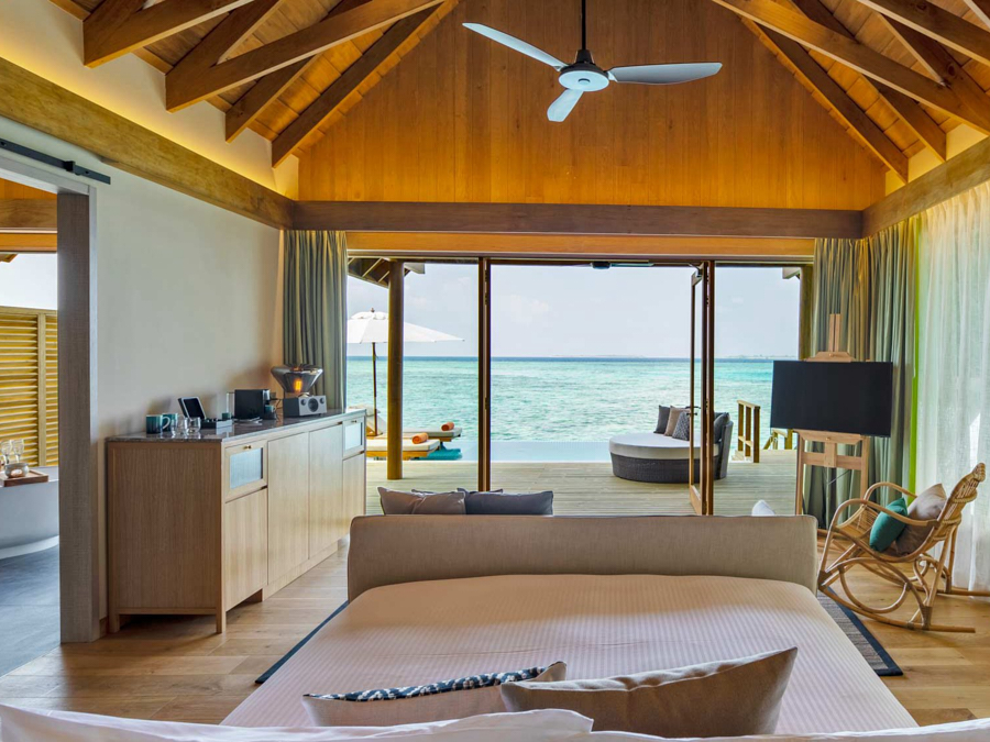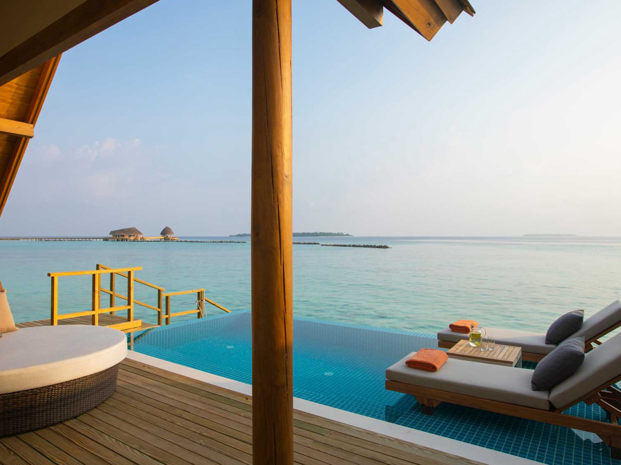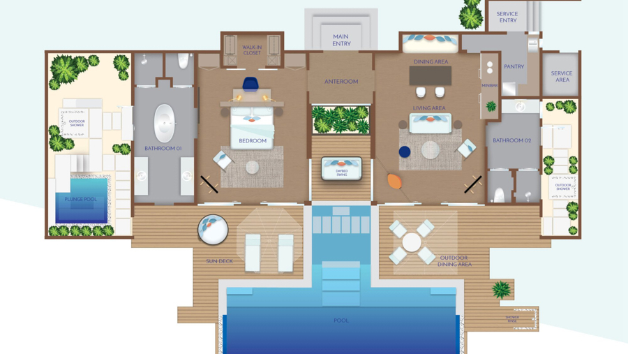 房型介绍:高级水上泳池别墅位于码头的远端,拥有一个3*10米多私用泳池,可从房间直接进入潟湖;这些水上别墅只有少数。膨胀木地板;毗邻的甲板上有一个私人的无限泳池。绿松石海的广阔视野。酒店还设有一个私人无边泳池、室内餐厅、步入式衣柜、空调浴室、浮潜设备和国际直拨电话。