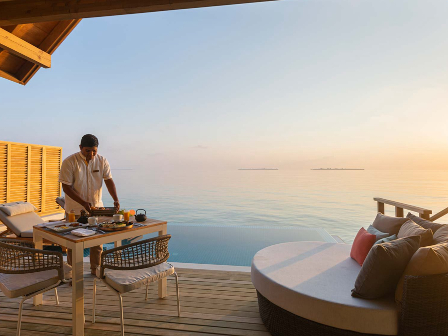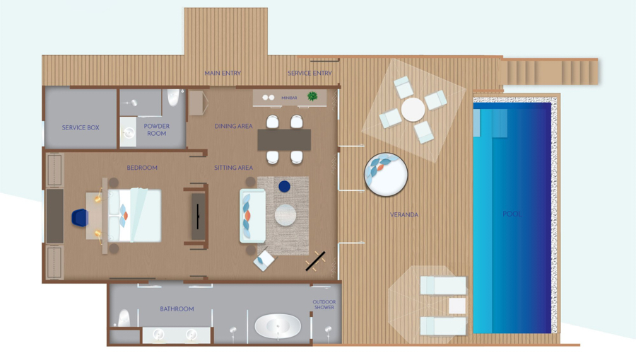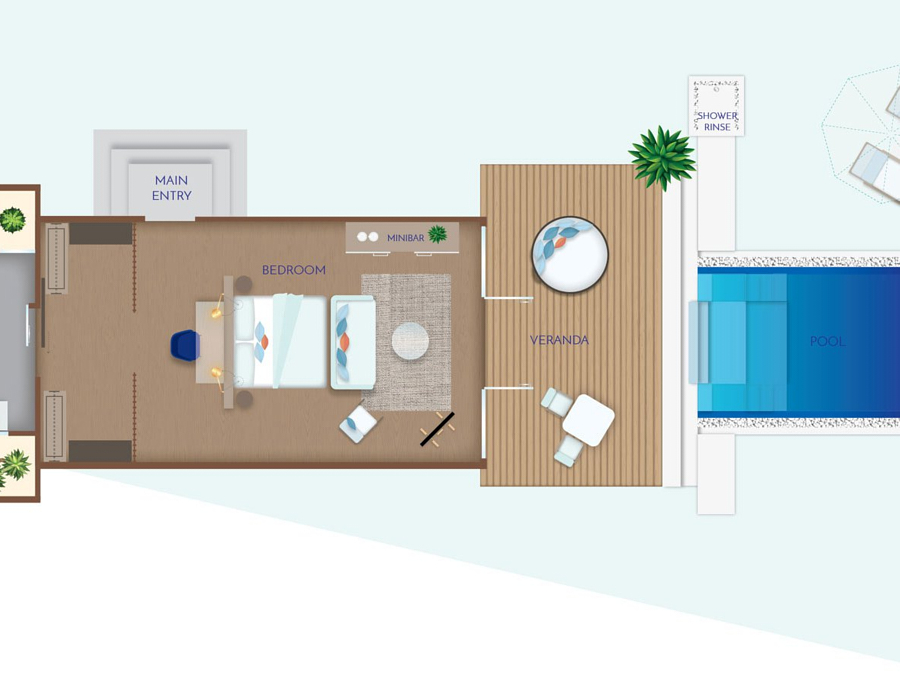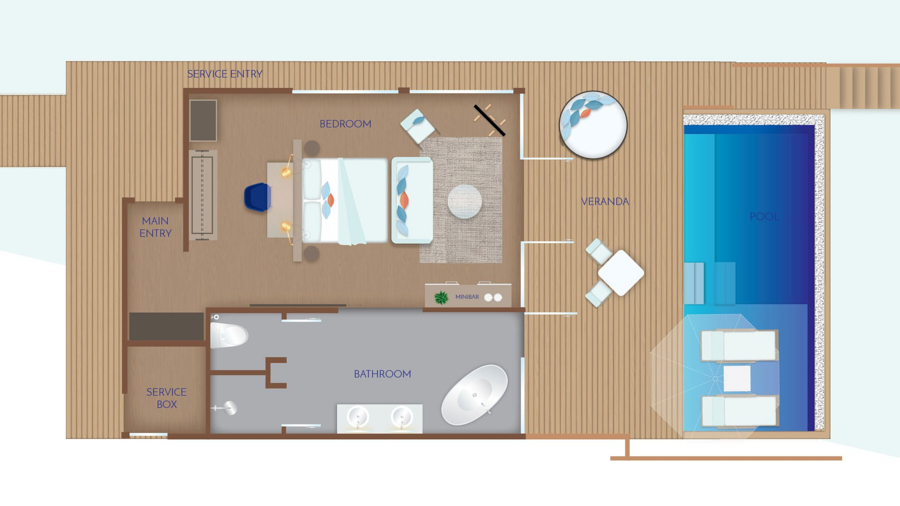 房型介绍:带游泳池的水上别墅位于度假村码头沿线,拥有一个8*3米的大泳池。它们以温暖的木质色调和大方的玻璃制成,因为它们都是为了观赏风景。无论你是泡在浴缸里,懒洋洋地躺在游泳池里,还是四肢伸开躺在甲板上。他们拥有一个私人无边泳池、大衣柜、空调浴室和一个带休息室家具的私人露台。