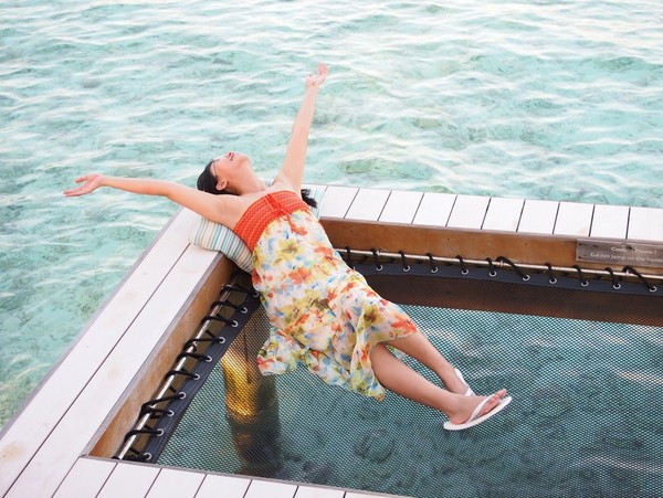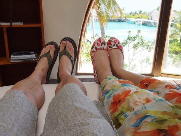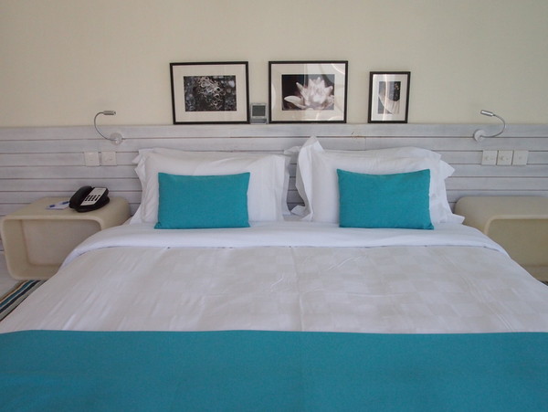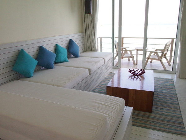 在Kandooma,水屋的面积最大,房间的沙发上都完全可以睡两个人。那边的床真的很高,要上个台子在上床,或许是为了早上躺在床上便于看日出吧