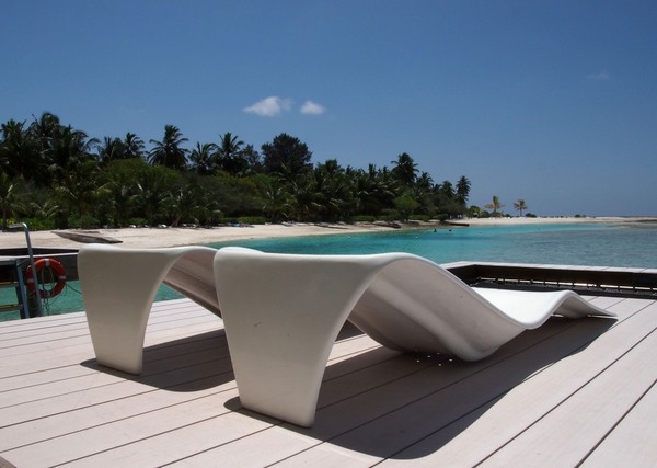 一条长廊从屋里通向大海,下面有休闲躺椅,也可以下海,这就是水屋的最大魅力