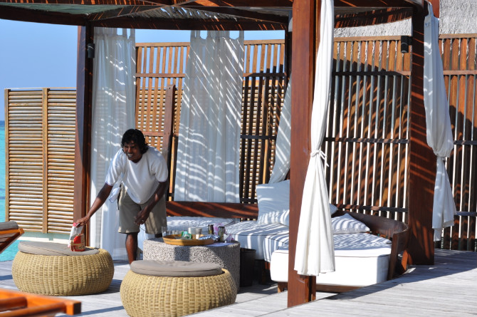 到达岛上以后,小黑们给我们每人一杯冰橙汁和凉毛巾,好贴心啊,然后背包什么的都不用自己去拿,他们负责拿到屋子,saito开着观光车带我们浏览介绍整个岛屿。说实在的,我的英语确实蛮烂的,有点听不懂,还好有老公,不过大概说的地方在其他人的攻略上也都有提到过。太过兴奋,这段忘照相了,遗憾啊。