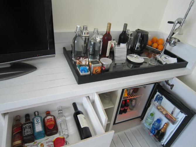 3、饮水:房间内有开水壶、咖啡壶、榨汁机、茶壶,可以自己动手用酒店每天送的瓶装饮用水、新鲜水果及咖啡粉、红茶、花果茶包等制作各种饮料。