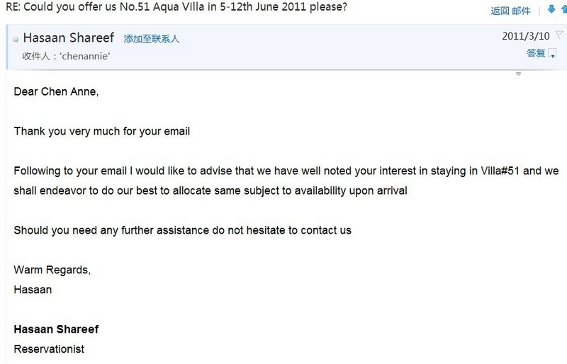 My name is XXX, you can call me Annie. My husband and I have booked 7 nights Aqua Villa in 5-12th June 2011 by a travel agent. I have sent a Confirmation letter to you in 4th March 2011, and hope to stay in No.46 Aqua Villa at that time.