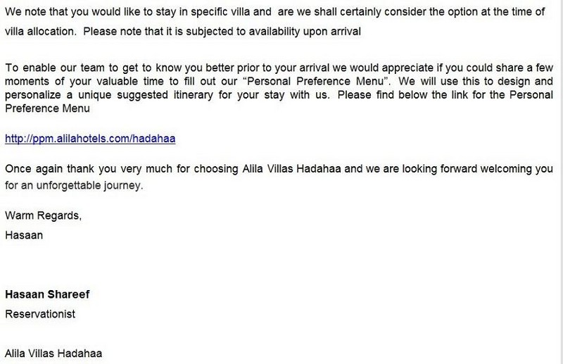 First of all I would like to thank you for your recent stay with us at the Park Hyatt Maldives Hadahaa.
