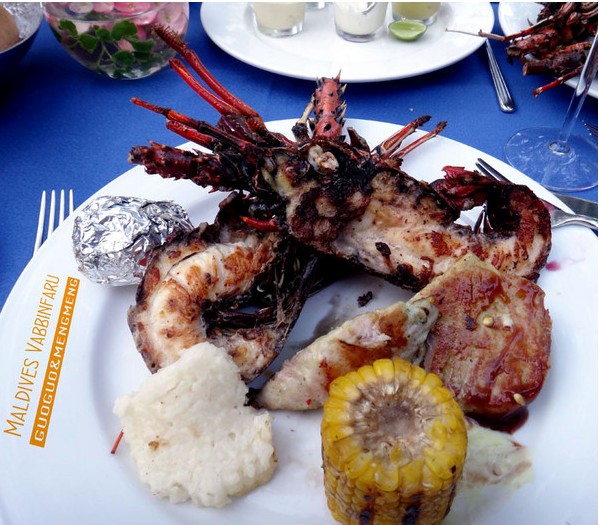 我们的龙虾,玉米,鱼肉,土豆,米饭团!