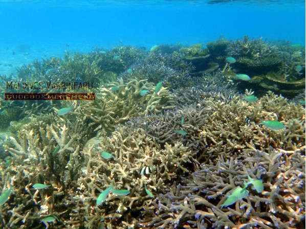 很漂亮吧!瓦宾法鲁的海,有过度色。有点深的蓝色是有珊瑚的地方哦,再远的,就是深海,是海沟咯!这种漂亮的过渡色在IHURU就没有了。