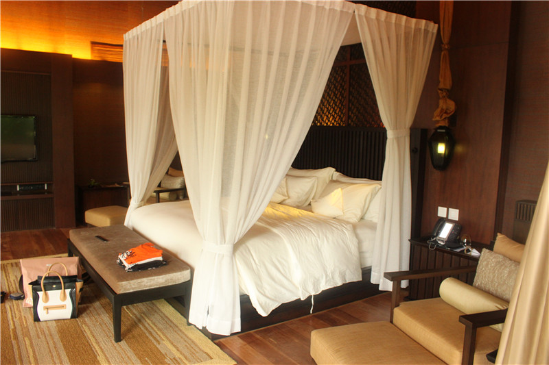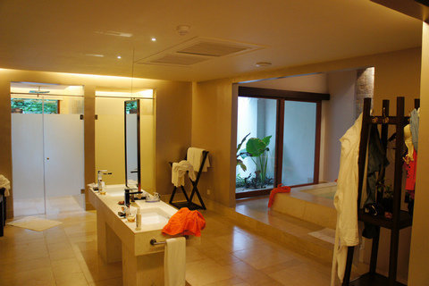 水屋比沙屋还要大 我觉得有300平 我们住的24号水屋 浴缸神马都是露天的 外面有一块隔板 外面是看不到的 水屋的床睡五个人是没问题