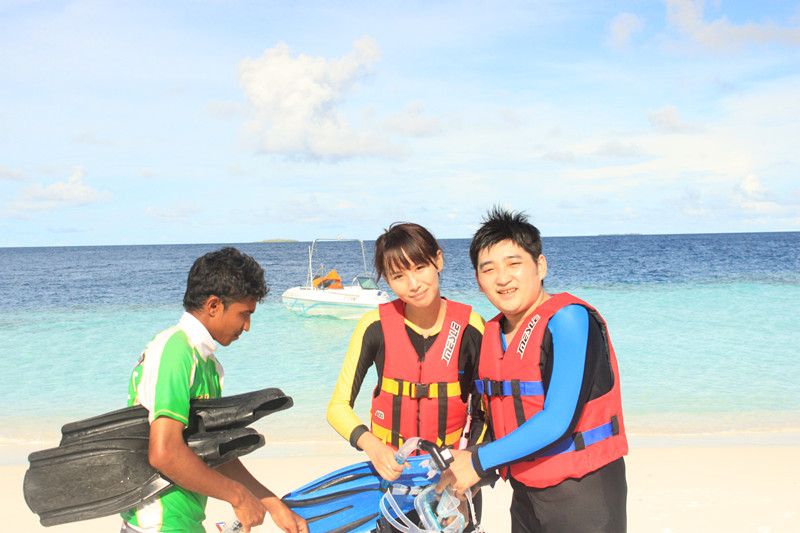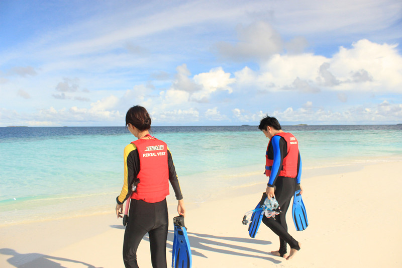 关于浮潜设备那边都有 不过我自己买的 我建议是买一个全干的呼吸管 虽然那边都消毒 但是咬嘴巴里的还是自己的卫生 还要买潜水袜 脚蹼行动不方便 要倒着走 我们穿的潜水鞋会进沙子总结下来潜水袜最好