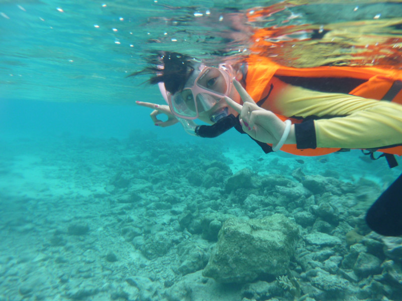 以为穿上救生衣就没问题下海穿上脚蹼就呆得了 行动好困难啊 又上岸换了自带的潜水鞋