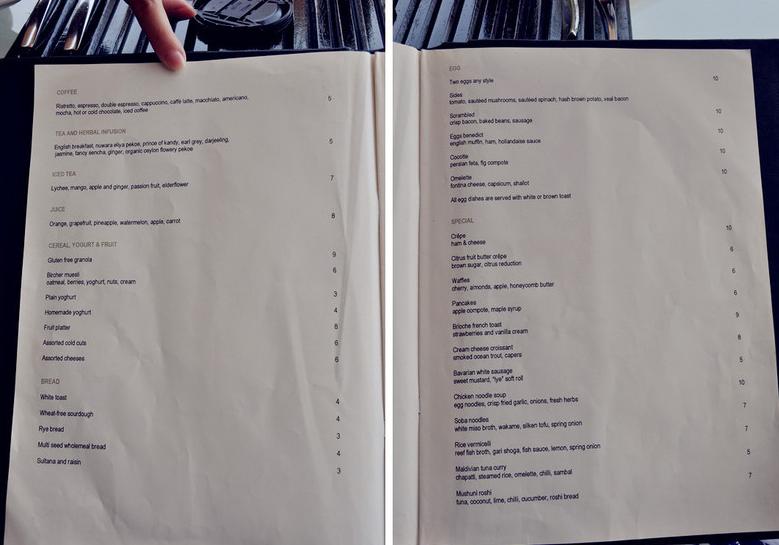 晚餐菜单,好像有两个版本的菜单,大体差不多,有几个菜不是特别一样,房间里有in villa dining的菜单,如果在房间里用餐,加收15刀,这个价格还算公道
