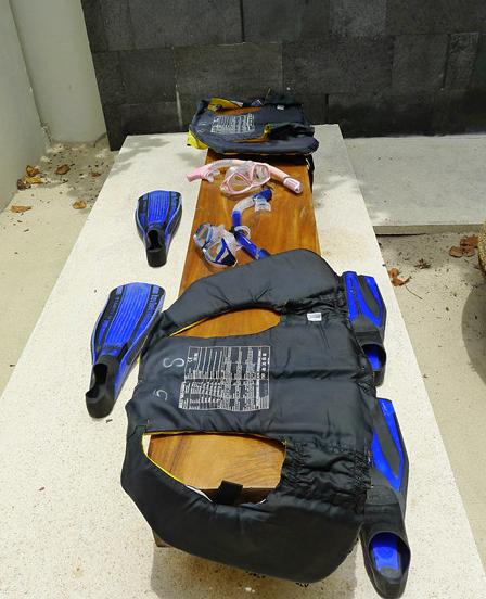 浮潜装备可以去岛上的潜水中心免费租借,呼吸管和面镜是我们自己带过去的,救生衣和脚蹼是在那里借的,最后check out时候还回去就行。第一次去浮潜,可以去潜水中心让教练指导一下哦,她会沿着海沟的边缘带着你游一个来回