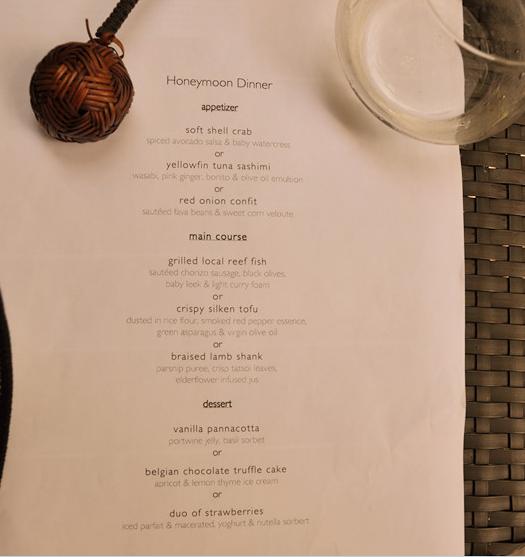 和代理订的时候就已经告知他们是蜜月旅行,所以上岛后有蜜月的房间布置、免费赠送的香槟一瓶还有一顿蜜月晚餐。上岛第二天管家就把menu给我们,让我们提前把选好菜和时间,提前告诉他就好。晚餐的地点通常就在餐厅的二楼,镂空的屏风格成一间一间的小餐室,够安静光线也够暗