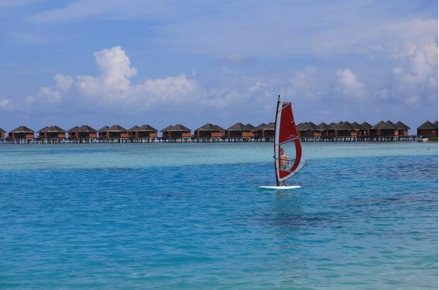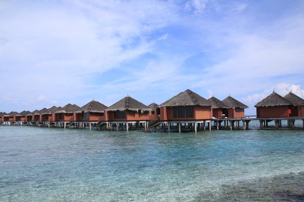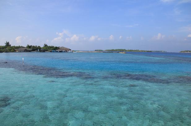 从水屋梯子下水,水可能就只到膝盖,水清澈见底,不时都看得到鱼群川梭在你脚边,沙很细软,但还是不能赤脚下水,最好的是洞洞鞋,可以走路,游 的话也不成问题,这真是我见过 的最美的海,不光是清澈见底,海水自然的分成几个颜色,阳光在海面上洒下闪闪金光,吹着轻柔的海风,国内就算是海滩质量最好的三亚吴支洲岛都根本不能和这相比.从我们住的水屋望出去,很远的地方有两个无人小岛,还可能远眺一下四季岛,据说是一个5星级岛,好像都是独栋别墅,相当漂亮,正望着远处美景出神,突然发现两个中国大姐,正涉水向远方的无人岛走去,胆子还大哦,看到他们背影一点点变小,最后消失在视线中,太COOL了,想起之前网上攻略看到过梦幻岛水屋确实可以涉水走到无人岛,但要在一大早上,如果等着晚上涨上胀潮回来就成问题了.心里想着鲁滨迅漂流记的种种情形,幻想着荒岛上可能发生的种种际遇,心里痒痒的,想那两个太婆都敢去,我有什么不敢的呢,于是沿着她们进行的路线,也下水了.一开始真是摸着石头过河的感觉,眼睛一直盯着水底,看清楚了水深再迈出脚步,在水下每走一步还是很费劲的,回来看下自己住的水屋也变得很小了,前方刚开始看起来遥不可及的小岛也变得越来越清晰起来.因为涉水前进不敢带相机,这时才发现自己已经走到了海水最浅的那个区域,远处仿佛就是海与天的交际的地方,再远点能看到阵阵海浪涌向天际,那估记都是离岛很远的地方了吧,走着走着觉得自己越来越平静,好像有点走到生命源头,甚至开始思考起生命的意思了,正在这个时候突然一阵水声打断了我的思路,定睛一看,就是传说中的魔鬼鱼得嘛,硕大的身躯像巨大圆盘,拖着一根长长尾巴,鱼圆盘直径可能有30厘米,一点都不夸张,当时我就不敢乱动了,怕若怒了它,据说是说喷毒汁的哦.等魔鬼鱼游远了,我才加快了步伐继续前进,到了,终于到了那个无人岛了,岛不大,可能就几十平方米吧,四周椰树环绕,岸边礁石上还有很多螃蟹,顺着沙滩上了岸,看到4个全身浅水装备的中国朋友,看到有人有放心了不少,一问他们是从最远的水屋潜水过来的,还带了水下相机,太酷了,展示给我看了,拍的水下鱼群,太神奇了,还告诉我,可以一直潜到四季岛(前面提到的另一个5星岛)不过在上岸前被工作人员赶出来了,呵呵,他们还要去更远的一个椰子岛,问我有没兴趣一起,算了,我啥子装备都没得,一会胀潮了还不好办,还是不要跟他们去冒险为好,和他们拍照留念了之后,就原路朝住的水屋走去。话说从无人岛涉水回来,就快到免费赠送的SUNSET FISHING时间了,这里要告诉大家千万不要去海钓,完全都钓不起来,还要第二天的看海豚,千万不要去,至于为什么先不告诉你们.我们是下午16:30出海的,开了1小时,船终于抛锚了,学着几个黑娃的姿势洒下鱼线,等了20多分钟,都没鱼上钩,诱饵是大片大片海鱼肉,拖起来看都还是原封不动的(这要补充一下,很可能这诱饵就是每天餐厅必不可少的咖喱鱼肉,肉老又硬难吃的要死,又醒得很,难怪鱼都不想咬啊).旁边的黑娃钓的时候口中还念念有词,好像说的是:FISH,FISH,SEND ME A FISH,真是好笑,天都要黑完了,