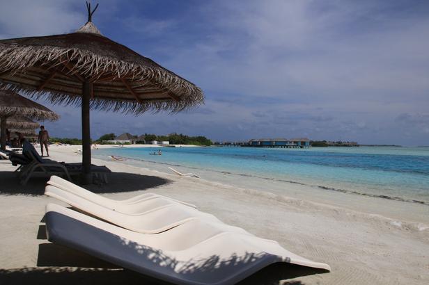 从广州出发的航班飞了接近7个小时,我的天啊,时间太长了,真的是屁股都坐痛了,快到马累的时候在飞机上填好了入境卡和离境卡,都是全英文的。终于到了,马累时间比北京时间早3个小时,下飞机我就把手表调到了当地时间.马累机场不大,感觉很陈旧,放眼望去满眼的黑娃工作人员和蒙着神秘面纱的中东妇女,蝌蚪一样的阿拉伯文,还有四处弥漫奇怪的香味,忍不住很想拿出相机拍一张,看到海关醒目的NO PHOTO,还是算了,被逮着了多事. .出了海关,按照事先问好的程序,直接去找要去的梦幻岛接待柜台,那个梦幻岛叫CHAAYA DHONVELI,好绕口的发音,找个黑娃,发了几次音,对方总算是听懂了,来了接待柜台,等待同一航班所有人到齐之后,坐了30分钟快艇(有些远的岛要坐水飞的)终于看到了一个醒目的蓝色大脚板---梦幻岛的标志。这里行礼服务做得很好,只要报了房号,完全不用你操心,自然有人送到房间门口.不过记得要给小费。 已经是当地时间9点过了,快速到酒店前台CHECK IN ,热情的工作人员为每位游客送上热毛巾和一杯精美得像鸡尾酒的热带果汁.(后来才知道只有刚到的客人才喝得到,你下回再要是没得的哈),