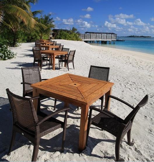 沙滩摆有餐桌,都是为晚餐的时候享受浪漫的烛光而布置的,