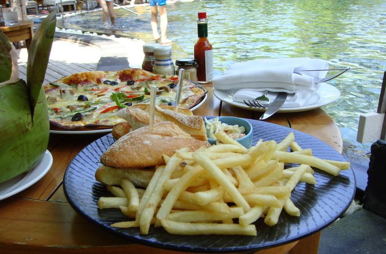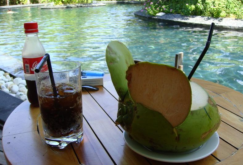 去家庭泳池边上的餐厅吃点东西,浮潜消耗了体力,吃点补充能量,下午好继续玩,先喝点水,老公的可乐