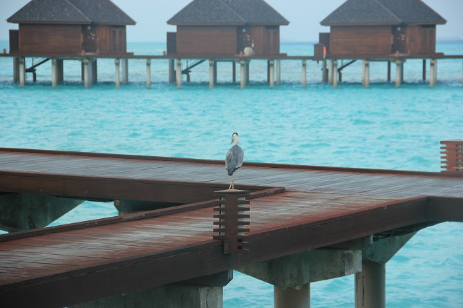 今早很惊喜的发现房间外面的走道上有只鸟,很专注地等着随潮水而来的鱼……