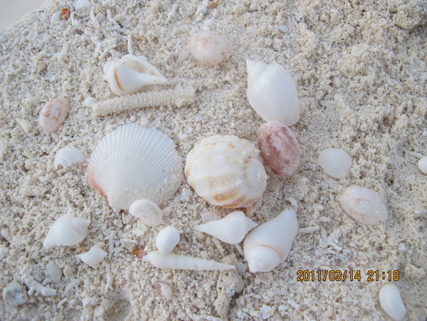 沙滩上的贝壳很特别~~仔细看有一个贝壳像泡泡!